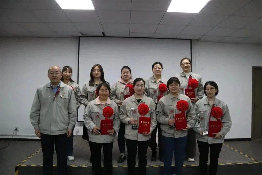 公司工會主席趙新偉宣讀表彰文件,為9名受表彰的三八紅旗手頒發(fā)榮譽。